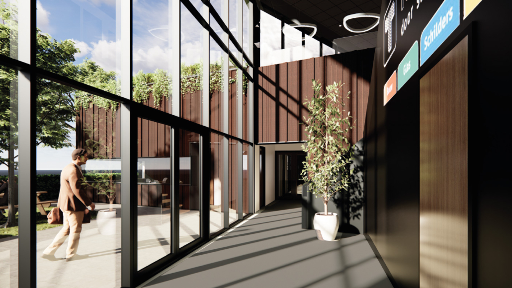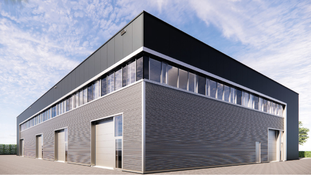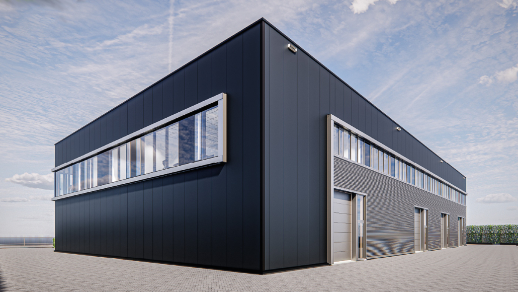 Hardeman | van Harten gaat in april van start met de levering en montage van 1.280 m² sandwichpanelen in Ral 7016 t.b.v. de gevel, 300 m² golfprofielplaat en 200 m¹ aluminium composiet kaders, beide voorzien van een coating in Ral 9006.